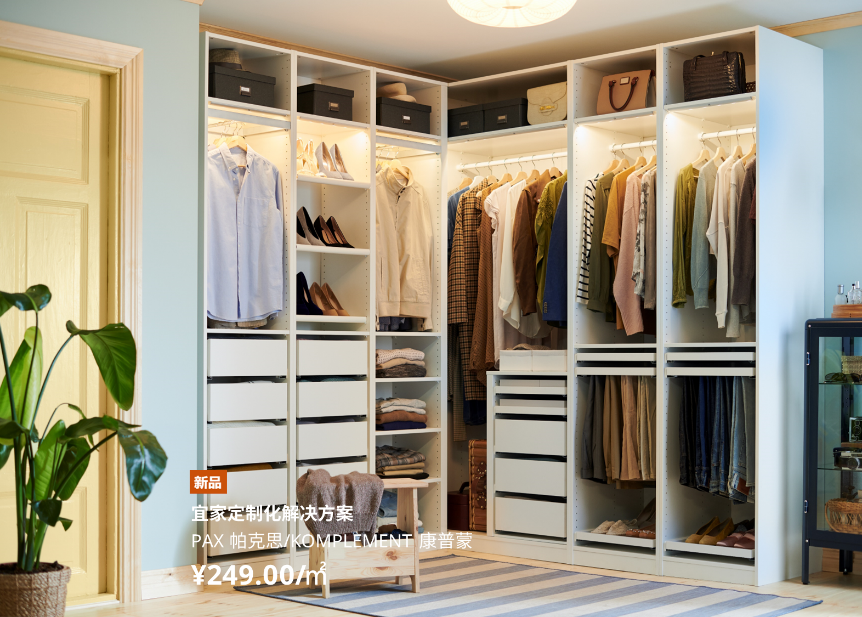 宜家经过调研发现中国消费者对量身定制的居家收纳空间偏好,2024财年宜家中国正式推出适应中国消费者需求的宜家PAX 帕克斯定制服务。以PAX 帕克斯标准柜体为基础,搭配以KOMPLEMENT 康普蒙为代表的储物内配,可根据每个家庭的实际空间情况、使用习惯,提供量身定制的加配柜体,以实现柜内外空间的充分利用,打造满足中国消费者的个性化的宜家定制化收纳解决方案。