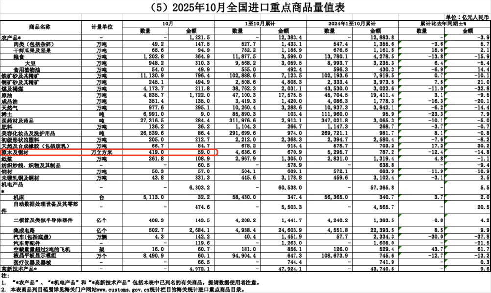 2025年10月中国原木及锯材进口419万立方米,累计同比降12.4%