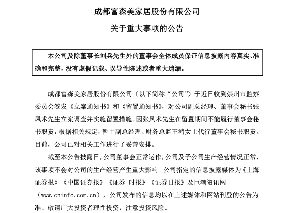 11月25日,富森美发布公告称,公司副总经理、董事会秘书张凤术被崇州市监察委员会立案调查并实施留置。留置期间,其董事会秘书职责暂由副总经理、财务总监王鸿代行,公司表示该事项与公司无关,生产经营正常。值得关注的是,今年7月公司创始人、董事长刘兵已被实施留置,至今尚未公布后续进展,半年内两位核心高管接连失联引发市场关注。
