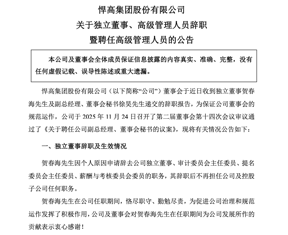 11月24日,悍高集团披露高管变动公告,独立董事贺春海因个人原因辞职,辞去包括审计委员会主任委员在内的多项职务,辞职将在新任独立董事选举产生后生效;副总经理、董事会秘书徐昊因内部工作调整辞去相关职务,辞职后仍担任公司其他职务。同日,公司聘任夏祺为副总经理兼董事会秘书,其拥有多年投行工作经验,暂未取得董秘培训证明,目前代行相关职责。