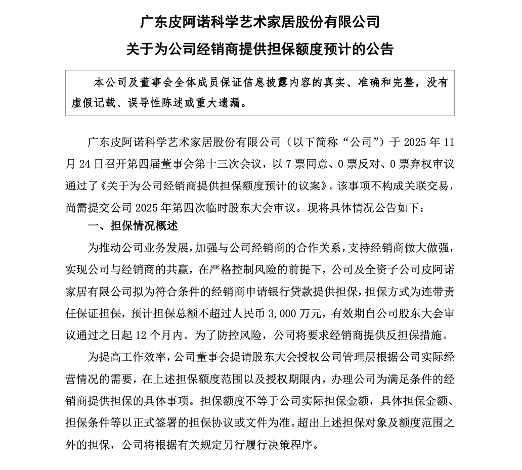 11月24日,皮阿诺召开第四届董事会第十三次会议,审议通过为符合条件的经销商提供担保的相关议案,该事项尚需提交2025年第四次临时股东大会审议。