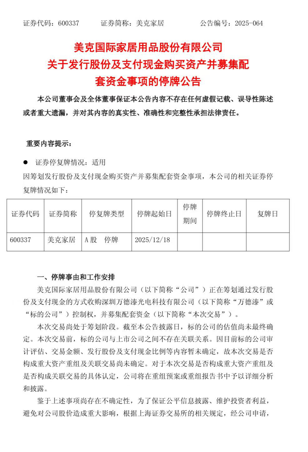 12月17日,美克家居发布公告称,公司正在筹划通过发行股份及支付现金的方式,收购深圳万德溙光电科技有限公司的控制权,并同步募集配套资金。这一跨界并购动向,在家居行业引发广泛关注。