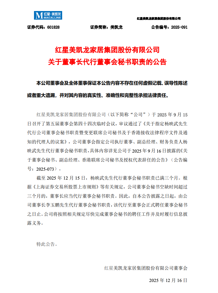 12月16日,红星美凯龙家居集团股份有限公司发布公告称,因董事会秘书职位空缺时间已超过三个月,自公告披露之日起,由公司董事长李玉鹏先生代行董事会秘书职责,直至公司正式聘任董事会秘书为止。