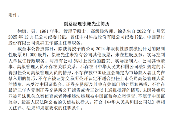 公开资料显示,徐谦出生于1981年,管理学硕士,高级经济师。其曾任中材科技股份有限公司纪委书记、中国建材股份有限公司党群工作部主任等职务。2022年1月至2025年12月期间,徐谦担任北新建材纪委书记,在集团治理、组织建设及综合管理领域具有较为丰富的履职经验。