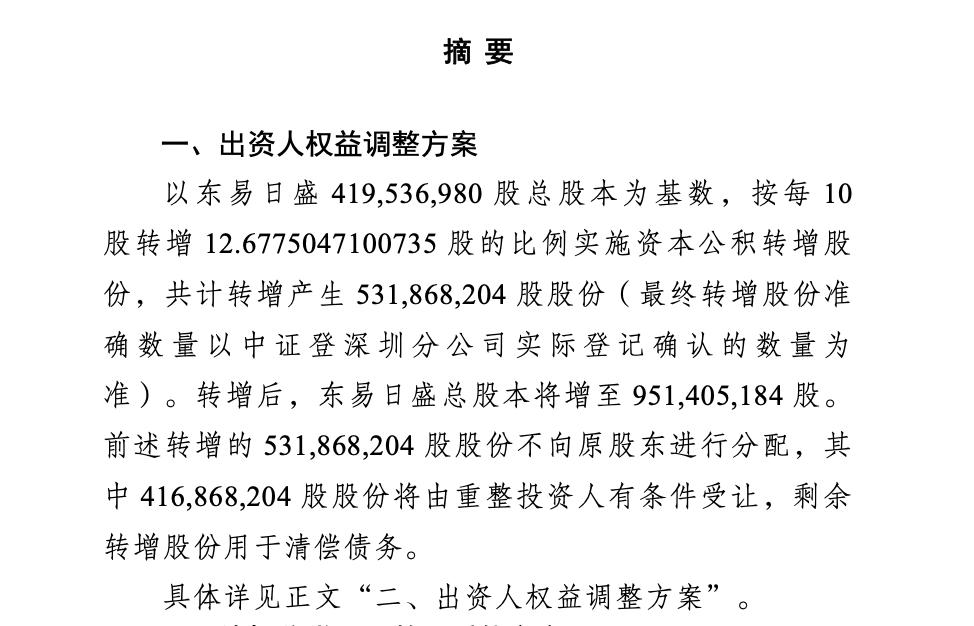 资本公积转增方面,以*ST东易现有4.20亿股总股本为基数,每10股转增12.68股,共计转增5.32亿股,转增后总股本增至9.51亿股。转增股份不向原股东分配,4.17亿股由重整投资人受让,剩余用于清偿债务。