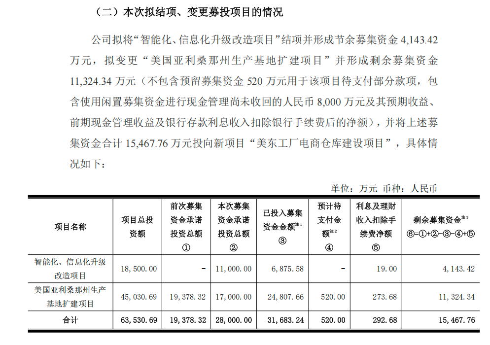 根据公告,此次调整并非简单叫停海外制造,而是在原有产能已阶段性满足市场需求的基础上,优化资源配置方向。原亚利桑那州项目在完成厂房改造及部分设备投入后,仍保留后续推进空间,相关剩余资金则被集中用于支持更具现实迫切性的电商仓储建设,以提升募集资金整体使用效率。