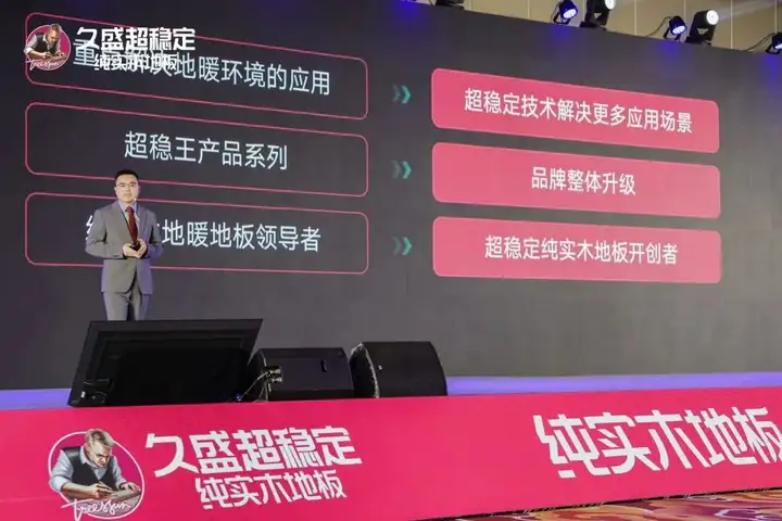 会上,久盛正式发布品牌战略,将“纯实木地暖地板”升级为“超稳定纯实木地板”。这不仅是久盛深耕纯实木领域26载后的又一次巅峰突破,更是对实木品类边界的一次大胆重构。