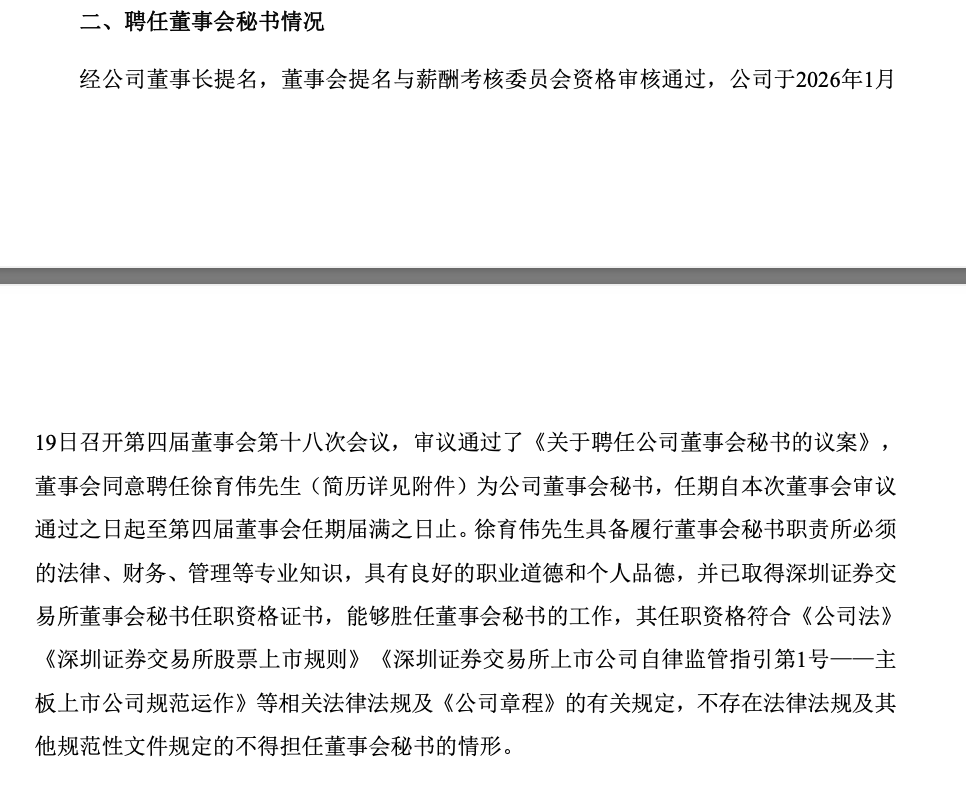 1月19日,蒙娜丽莎发布公告称,公司第四届董事会第十八次会议审议通过相关议案,聘任徐育伟为公司董事会秘书,任期至第四届董事会任期届满之日止。本次聘任前,公司董事、董事会秘书张旗康因个人原因辞去董事会秘书职务,辞任后其仍继续担任公司董事一职。