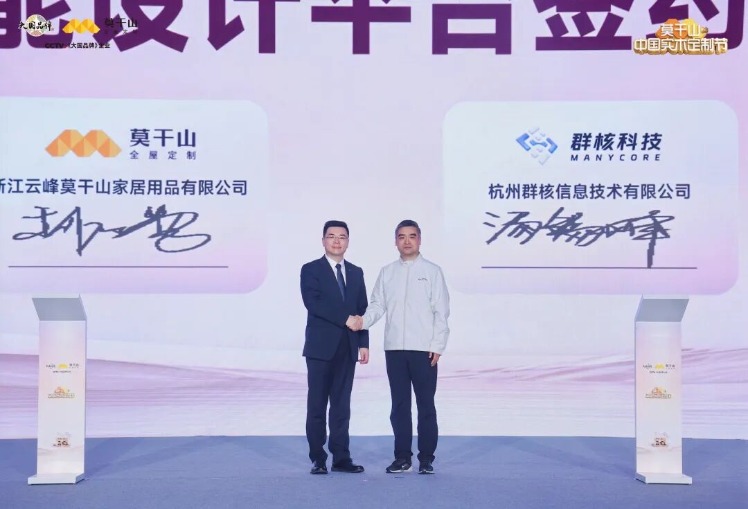 同时,莫干山全屋定制与酷家乐正式签署战略合作协议。莫干山大家居总经理刘元秀与群核科技副总裁汤锡峰共同登台签约。以此次合作为起点,双方将继续携手探索数字化设计与智能制造的新边界,以科技之力,让实木定制真正从“制造”走向“智造”。