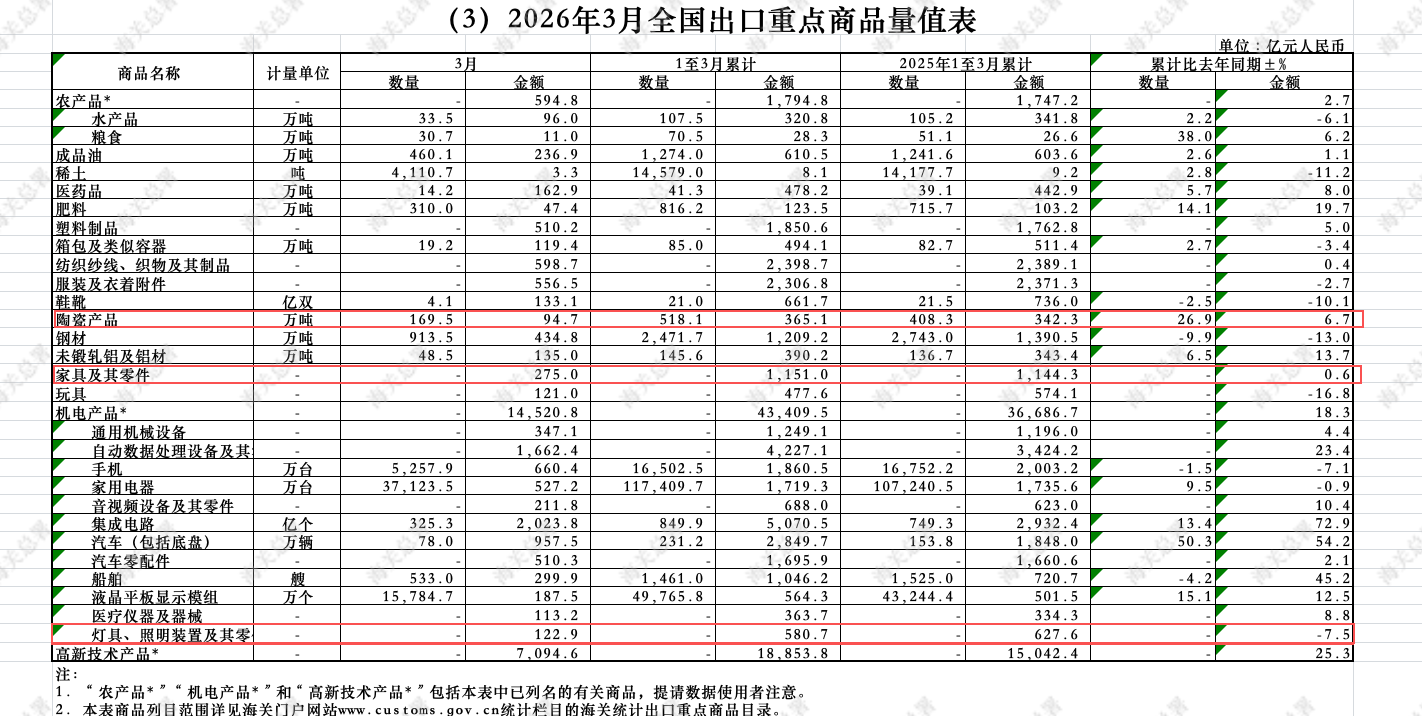 4月14日,海关总署发布1-3月全国出口重点商品量值表,一季度我国家居建材出口呈现“冰火两重天”的分化态势,三大核心品类表现迥异。其中,家具及其零件出口额1151亿元,同比增长0.6%,凭借庞大的出口规模保持稳健态势,成为支撑行业出口的“压舱石”;陶瓷产品表现亮眼,出口额365.1亿元,增长6.7%;灯具照明产品出口580.7亿元,下降7.5%。