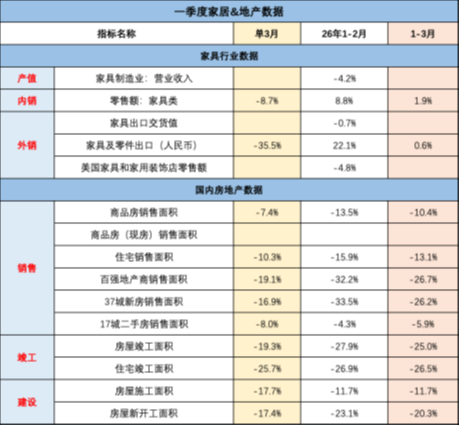 家居外销端短期虽受海外市场波动影响,但随着国内家居企业加速渠道与产品结构优化,长期增长韧性仍存,1-3月我国家具及零件出口额小幅微增0.6%。