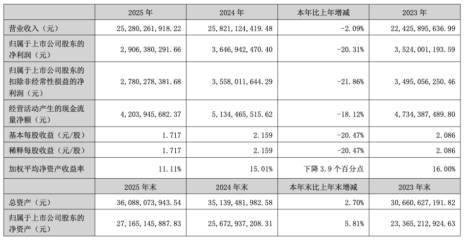 3月26日,北新集团建材股份有限公司(简称“北新建材”)发布2025年年度报告。报告显示,北新建材实现营收252.80亿元,同比微降2.09%;净利润29.06亿元,同比下降20.31%。