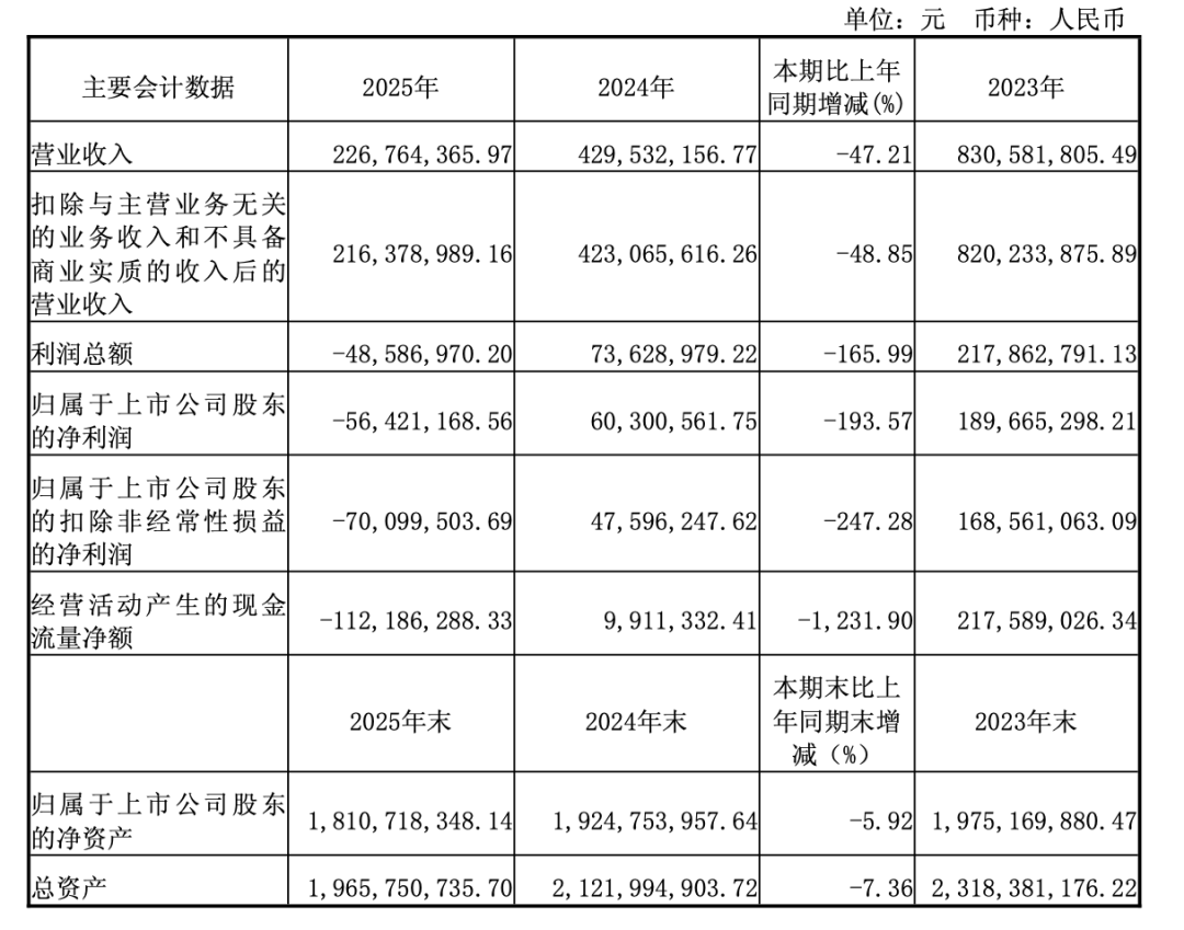 4月21日,浙江帅丰电器股份有限公司(简称“帅丰电器”)发布2025年年度报告。报告显示,帅丰电器2025年实现营业收入2.27亿元,同比下降47.21%;净利润-5642.12万元,同比下降193.57%。