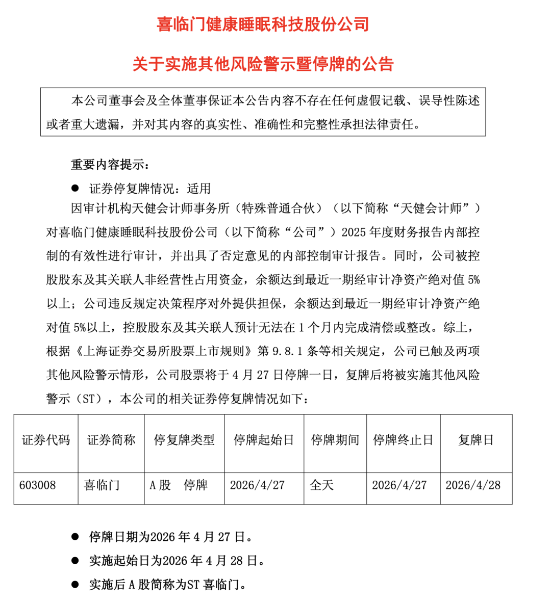 4月24日,喜临门发布公告称,公司因触及两项其他风险警示情形,股票于27日停牌1天,4月28日起正式实施其他风险警示,简称变更为“ST喜临门”。