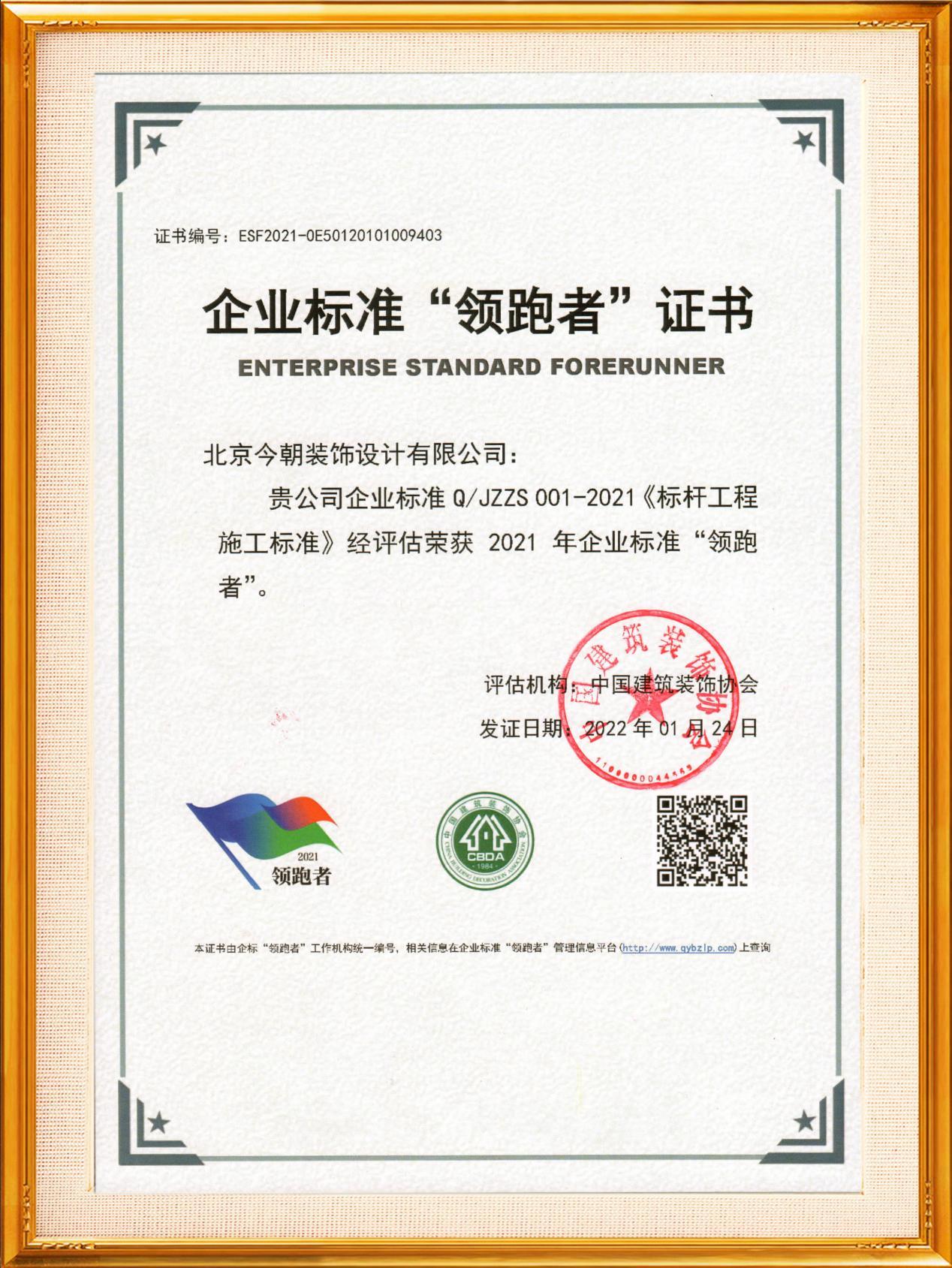 4.2022年今朝装饰《标杆工程施工标准》荣获了中装协颁发的企业标准“领跑者”证书,标志着今朝装饰施工标准正式进入装修领跑者赛道。