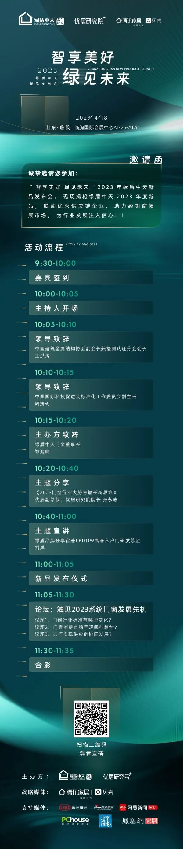 新品亮相,满足消费者美好家居生活需求。“智享美好 绿见未来”2023年绿盾中天新品发布会现场将举行隆重的新品发布会仪式,仪式邀请到中国建筑金属结构协会副会长兼检测认证分会会长王洪涛,中国国际科技促进会标准化工作委员会副主任周妍玥,绿盾中天门窗董事长郑海峰,优居副总裁、优居研究院院长张永志,居然之家山东分公司总经理孙景文,北京晨月宜居总经理王廷国等出席,为经销商带来全新产品,引爆终端消费市场。此次 “智享美好 绿见未来”2023年绿盾中天新品发布会不仅涵盖主题分享、主题宣讲等形式,同时也设置了一场高峰论坛,本场论坛由优居副总裁、优居研究院院长张永志主持。论坛汇集中国建筑金属结构协会副会长兼检测认证分会会长王洪涛,绿盾中天门窗董事长郑海峰,供应链代表FSB福适博门窗五金中国首席代表王石涛,优秀加盟商代表北京晨月宜居总经理王廷国等,嘉宾们将从多个角度和领域就“行业标准有哪些变化?对门窗行业提出了哪些新的要求?”“门窗消费市场呈现哪些趋势,如何用新品引爆终端消费市场?”“如何实现供应链协同发展?”三个议题展开深度对话,寻求门窗行业高质量发展新路径。智享美好,绿见未来。4月18日,在山东临朐相约2023年绿盾中天新品发布会,与优秀供应链企业一起共探系统门窗市场发展新趋势,构建绿色、和谐供应链体系,引爆终端消费市场,满足美好家居生活需求!